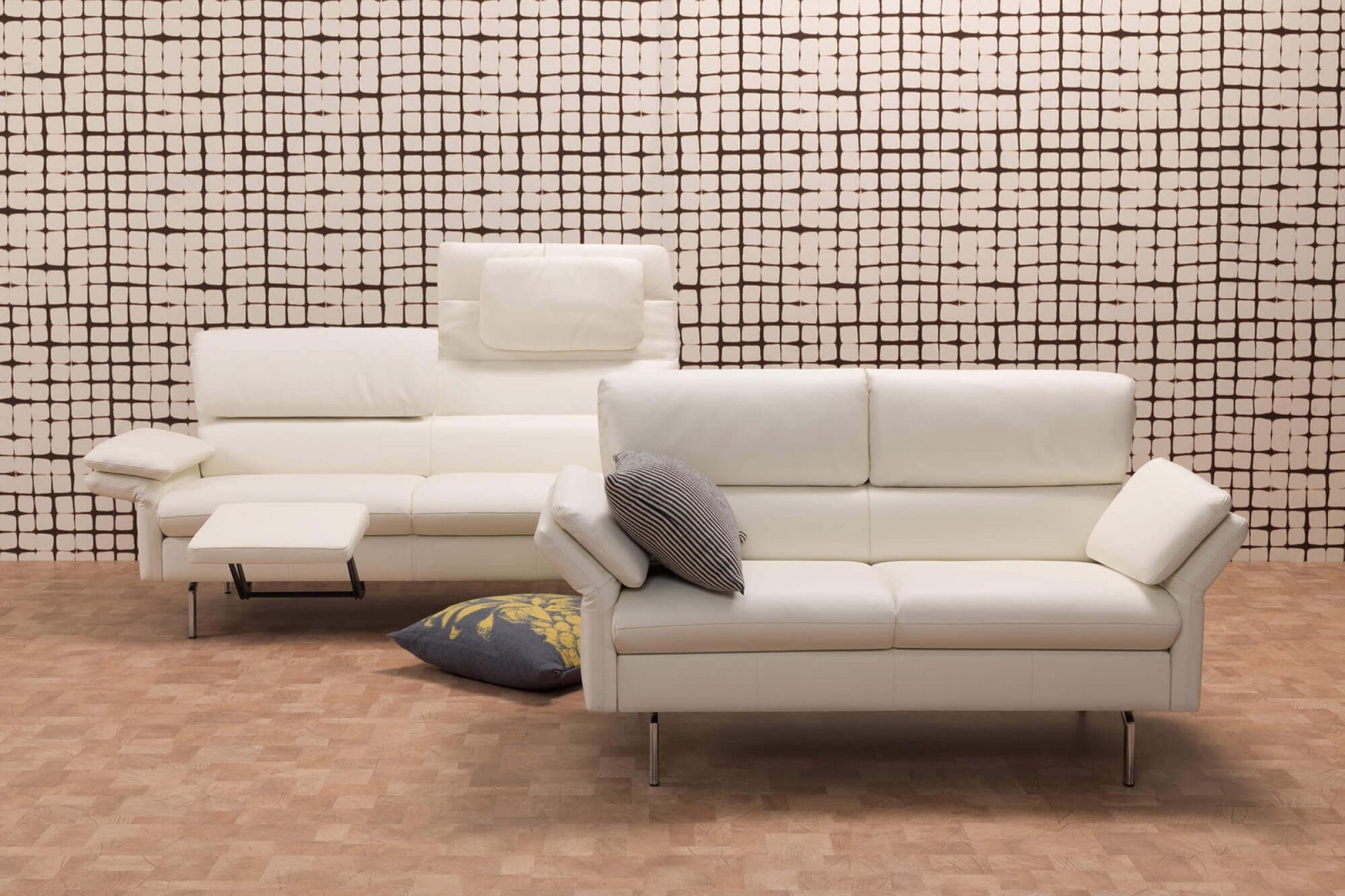 Hochklappbare Nackenkissen und Fussstützen machen aus diesem Sofaprogramm innerhalb weniger Sekunden eine Wohlfühloase.