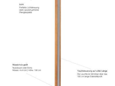 Ihnen ist die Leuchte zu hell? Über das Edelstahlprofil, welche über die ganze Höhe der Lampe verläuft, kann das Licht mit einer Fingerberührung einfach gedimmt werden. Neben der Dimmfunktion kann die Leuchte auch über das Edelstahlfilet ein-/ausgeschaltet werden. Die Stehlampe Säntis verfügt über eine Memoryfunktion - die letzte Dimmstufe wird gespeichert.
